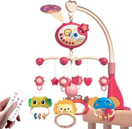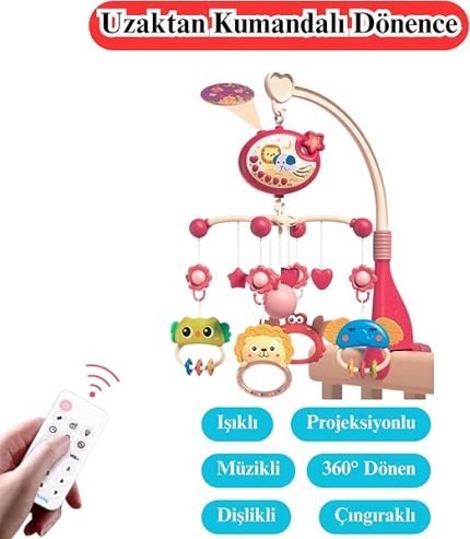Pilli Işıklı Müzikli Projektörlü Kumandalı Sabitlemeli Dönence Çıngıraklı Dişlikli Bebek Yatıştırıcı Zaman Ayarlı (kırmızı)
