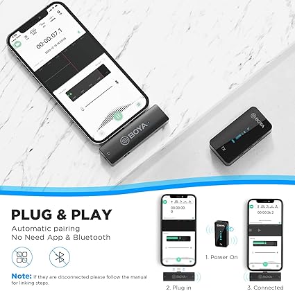Bu ürün hakkında Kolay Otomatik Bağlantı: Bu yenilikçi kablosuz lav mikrofonun ayarlanması çok daha kolaydır. Adaptör, Bluetooth veya Uygulama gerekmez.