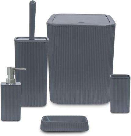 5 Parça Kare Lüx Plastik Banyo Seti 7 Litre Dokunmatik Çöp Kovalı, Antibakteriyel Fırça, Kare Şeklinde Modern Banyo Seti (GRİ)