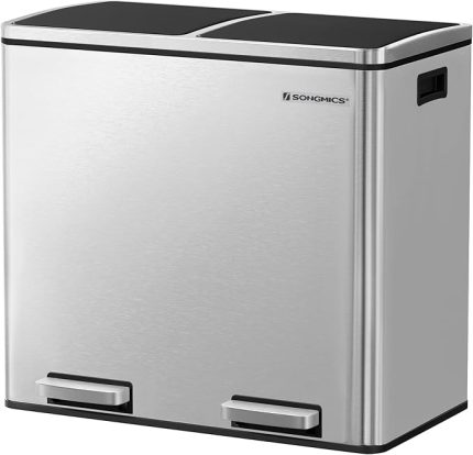 2 Bölmeli Atık Ayırma Sistemli Pedallı Çöp Kovası, Atık Kovası, Mutfak İçin, 2 x 24 L, Yumuşak Kapanmalı, Plastik İç Kova, Pedallı ve Kulplu, Gümüş Rengi, Ltb48Nl