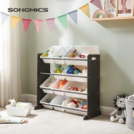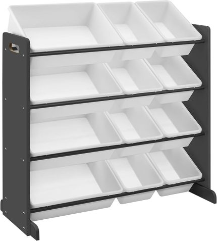 Çocuk Odası Rafı, Oyuncak Düzenleyici, Çocuklar için Ayakta Raf, Pp Plastikten Yapılmış 12 Saklama Kutusu, Çocuk Odası, Okul, Kreş, 86 X 26.5 X 78 cm, Koyu Gri-Beyaz Gkr04Gy