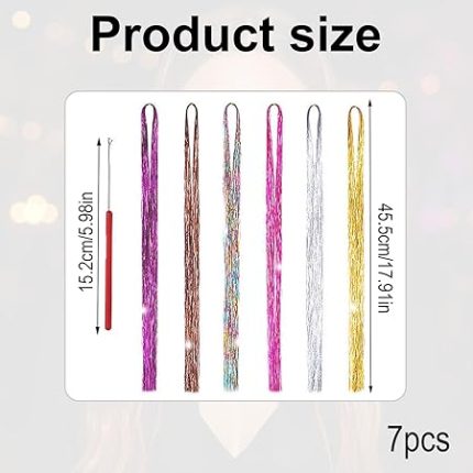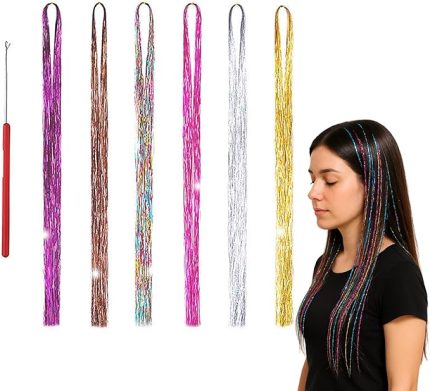 6 Renkli Saç Teli Postiş Seti – Partiler, Düğünler, Doğum Günü Partileri için Renkli Parıltılı ve Tinsel Saç Telleri. Doğal veya boyalı saçlar için parlak uzatma seti