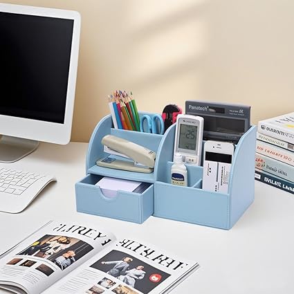 (Blue) – 7 Storage Compartments Multifunctional PU Leather Office Desk Organiser,Desktop Stationery Storage Box Collection, Business Card/Pen/Pencil/Mobile Phone /Remote Control Holder Desk Supplies Organiser (Blue)