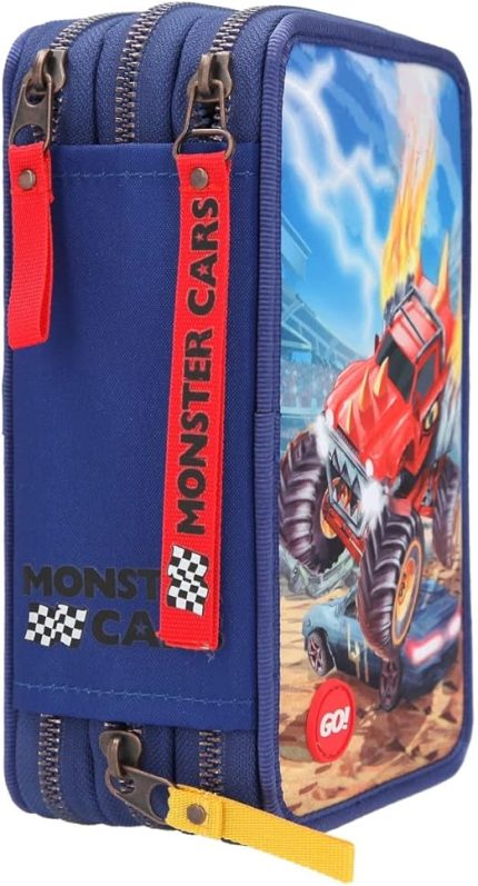 11859 Monster Cars – Canavar kamyon tasarımında doldurulmuş 3 bölmeli kalem kutusu, heyecan verici LED efektleri ve kırmızı kolye ucu, renkli kalemler, cetvel, makas ve çok daha fazlası ile koyu mavi öğrenci çantası.