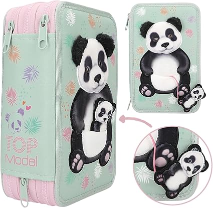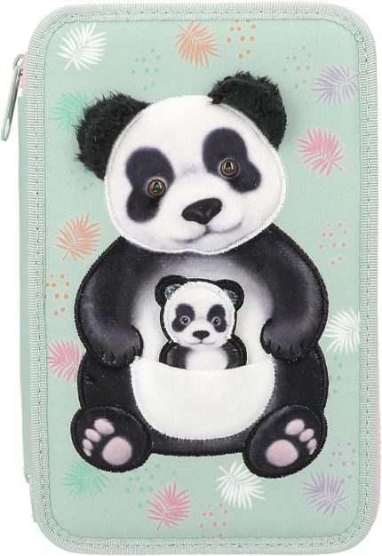 12786 TOPModel Wild – Doldurulmuş 3 bölmeli kalem kutusu, nane yeşili, Panda uygulamalı, renkli kalemler, cetvel, makas vb. içeren kalem kutusu