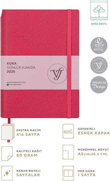 – Ajanda 25 – 26, Eylül 2025 – Ağustos 2026, 170 x 218 mm, haftalık görünüm, Wire-O ciltleme, lastik bant kilit, çok dilli, çıkartma, özel tasarım Anne Lehman