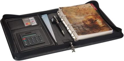 2025 Ajanda Suni Deri Fermuarlı 4 Halka Mekanizmalı Hesap Makineli Organizer, Siyah, 21X27 Cm