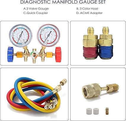 3 Yollu Akışkan Göstergesi AC Teşhis Manifoldu Freon Gösterge Seti Kuplörlü ve Acme Adaptörlü Akışkanlar