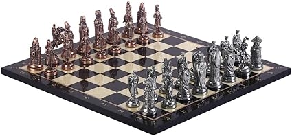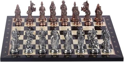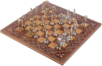 Büyük Boy Metal Osmanlı Bizans Satranç Takımı Antik ve Ceviz Desenli MDF Ahşap Satranç Tahtası (37×37 cm.)