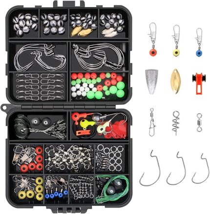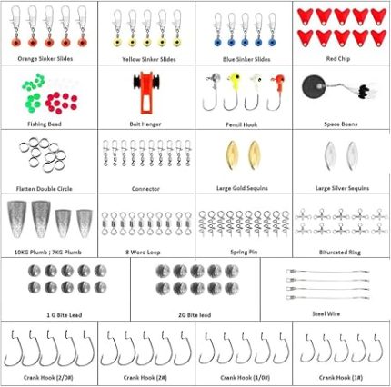 Olta kancası seti, olta aksesuarları seti, olta kancası, kurşun bas, batan ağırlıkları, çeşitli olta fırdöndü çıtaları, batan kaydırakları, olta ipi boncukları vb. dahil, çekme kutusu ile