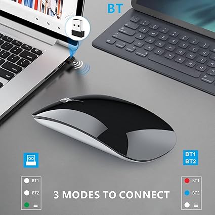 雨七 Bluetooth Fare, Ultra İnce Üçlü Mod (BT5.1+BT5.1+USB) iPad, Dizüstü Bilgisayar, MacBook için Şarj Edilebilir Kablosuz Bluetooth Fare (Piyano siyah)