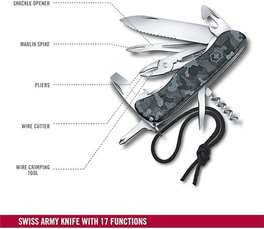 18 fonksiyonlu çakı, İsviçre’de üretilmiştir: Büyük tırtıklı bıçak, şişe açacağı, tornavida 5 mm (kilitlenebilir), kablo sıyırma pensesi, anahtar açacağı, marlçivi