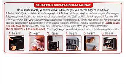 Porsima 0439 9 lu Standlı Kendinden Yapışkanlı Kaşıklı Kapaklı Baharatlık Takımı – Antrasit Beyaz Modern ve şık tasarıma sahip Ergonomik ve kolay kullanımlı Duvara monte edileiblir. Ürün ile birlikte gönderilen üstün kaliteli sert plastik maddeden yapılan aparatları kullanarak yapıştırabilirsiniz.