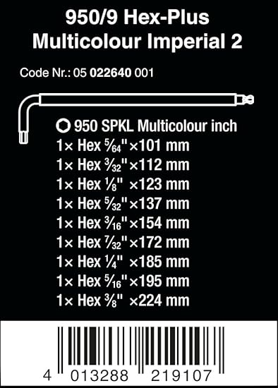 05022640001 950/9 Hex-Plus Multicolour Imperial 2 L Anahtar Seti, inç, BlackLaser, 9 Parça
