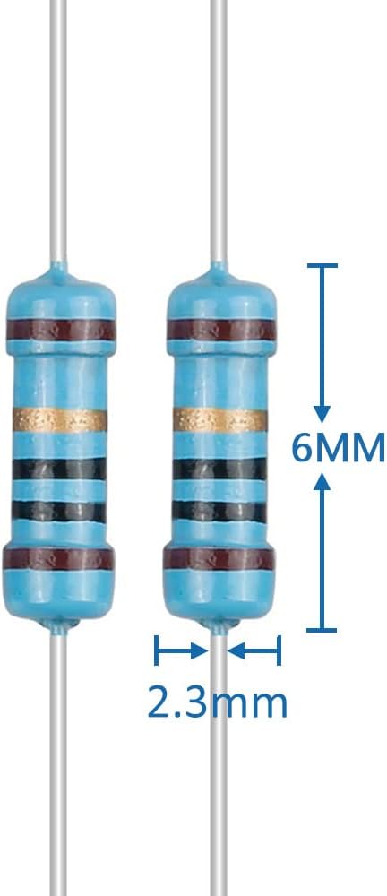 Direnç bilgileri: Çap: 2,3 mm, film uzunluğu: 6 mm, pim uzunluğu: 26 mm. ±1% toleransa ve tam RoHS sertifikasına sahip metal film dirençler pratik, yüksek hassasiyetli ve kararlıdır. Breadboard’lar için mükemmel doğruluk
