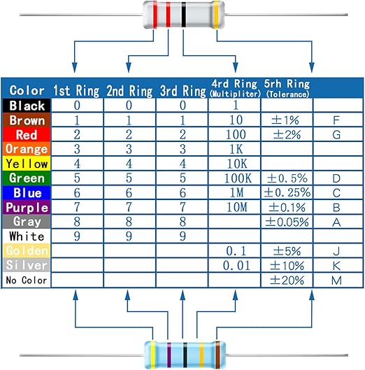 40 farklı değer: 0 10 22 47 51 68 100 150 200 220 300 330 470 510 680 1K 1000 2K 2,2K 3,3K 4,7K 5,1K 6,8K 10K 22K 33K 47K 51K 68K 100K 150K 220K 300K 330K 470K 510K 680K 1M 2,2M 5,1M 10M Ohm 1/4W Direnç