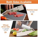 İKİ TARAFLI: Bu buğday samanı kesme tahtası, bir tarafı çiğ ve pişmiş et kesmek için gıda maddelerine uygun 304 paslanmaz çelikten yapılmıştır, diğer tarafı ise meyve ve sebzeleri kesmek için yüksek kaliteli buğday samanı PP malzemeden (BPA içermez) yapılmıştır. Çapraz pişirmeyi önlemek için çift taraflı bölgeleme.