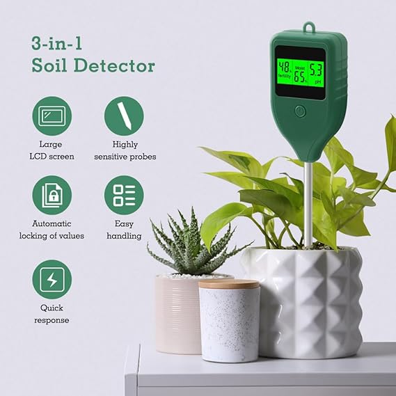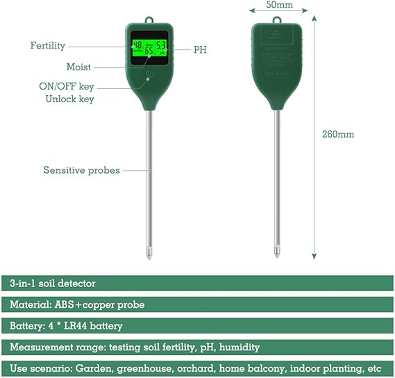 【3’ü 1 arada Toprak ü】Bu 3’ü 1 arada , toprak verimliliğini, pH’ı ve nemi kolayca ölçebilir ve bahçıvanlar, çiftçiler ve iç mekan bitkisi meraklıları için değerli veriler sağlar. Yüksek hassasiyetli problu uzun bir metal prob ile birlikte verilir, ölçüm cihazını açın ve probu toprağa 8-12 cm batırın, yaklaşık 3 saniye sonra aynı anda pH/nem/verimlilik gösterecektir.