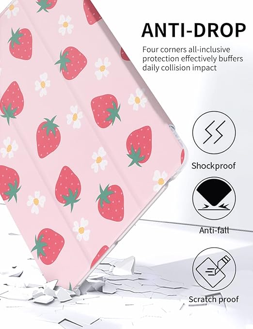 10.2 inç iPad 9./8./7. Nesil Kılıf, Kalem Tutuculu, Çilek Baskılı Üç Katlı Stand Koruyucu iPad Kılıfı 2021/2020/2019 için Otomatik Uyku Uyandırma ile, Pembe