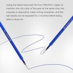 Geçmişin zengin rengini aynı anda maitain yapmak için Japonya’daki MiKUNI’den en son geliştirilmiş mürekkebi kullanarak, yazmayı daha pürüzsüz hale getirmek için viskozite azaltılır ve top boncuklar mürekkep çizmeden önce 2 ay boyunca açığa çıkabilir.