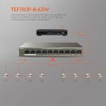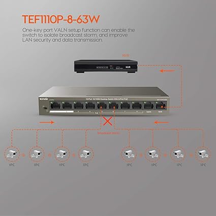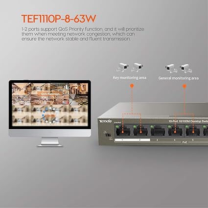 10 bağlantı noktalı Fast Ethernet PoE anahtarı, 8 PoE+ bağlantı noktası ve 2 Uplink bağlantı noktası (QoS, VLAN, 58W, IEEE 802.3af/at, 250 m iletim menzili, masaüstü ve duvara montaj)