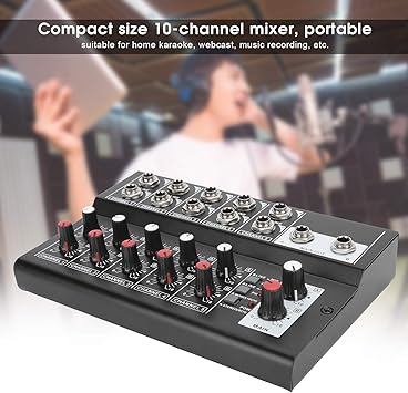 Kompakt boyutlu 10 kanallı mikser, taşınabilir, evde karaoke, web yayını, müzik kaydı vb. için uygundur.
