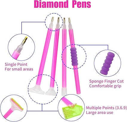 [Geniş Uygulamalar]: Bu elmas boyama aksesuarı kalemi sadece kendin yap 5D elmas boyama için değil, aynı zamanda ev işleri, tırnak sanatı elmas dekorasyon, telefon dekorasyonu ve diğer elmas ürünler için de kullanılabilir. Bu zengin elmas sanat boyama kalemi kombinasyonu ihtiyaçlarınızı karşılamak için yeterlidir, elmas boyama kalemi ve ideal elmas boyama aracıdır