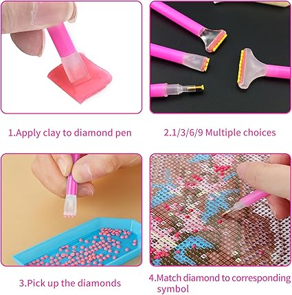 [Kolay ve rahat]: Önce elmas boncukları plastik bir plaka içinde düzgün bir şekilde düzenlemeniz gerekir. Ardından şeffaf koruyucu folyoyu elmas boyama mumundan çıkarın, elmas boyama aksesuarları kalemlerine elmas boyama için yapıştırıcıya bastırın, ardından gerekli elmasları yapıştırın ve son olarak belirli elmas boyama alanına yapıştırın