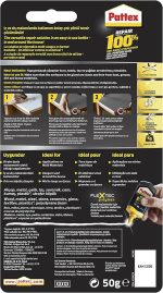 Ambalaj içeriği – Pattex 100 % Çok Amaçlı Yapıştırıcı, güçlü Flextec polimer formüllü şeffaf yapıştırıcı, 1x50g Baş aşağı şişe. *PE, PP, PTFE, ABS, PS (sert), bakır, pirinç için uygun değildir.