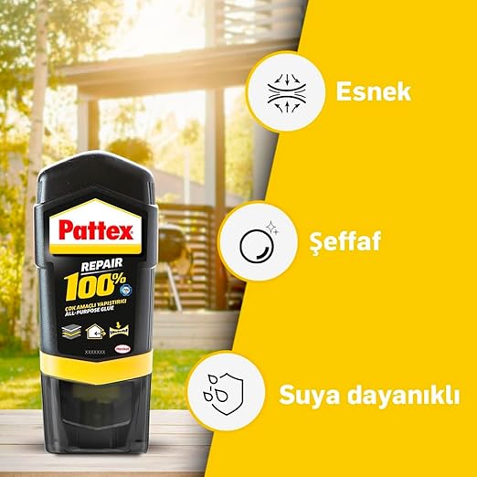 Ambalaj içeriği – Pattex 100 % Çok Amaçlı Yapıştırıcı, güçlü Flextec polimer formüllü şeffaf yapıştırıcı, 1x50g Baş aşağı şişe. *PE, PP, PTFE, ABS, PS (sert), bakır, pirinç için uygun değildir.