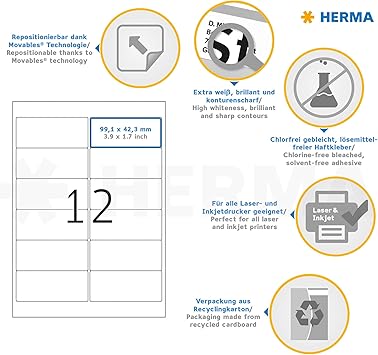 Teslimat kapsamı: 300 x HERMA yeniden konumlandırılabilir adres etiketi, DIN A4 formatında, 9,91 x 4,23 cm, dikdörtgen, beyaz (25 yaprak)