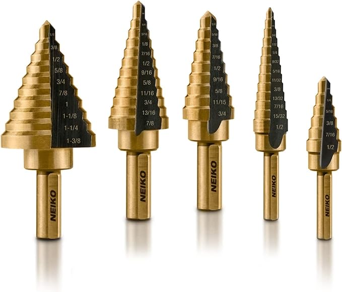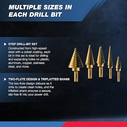 HSS STEP BIT: Plastik, alüminyum, bakır, paslanmaz çelik ve diğer birçok sac türünde delik açmak için klasik kademeli matkap seti. Delik genişletici olarak da kullanılabilir.