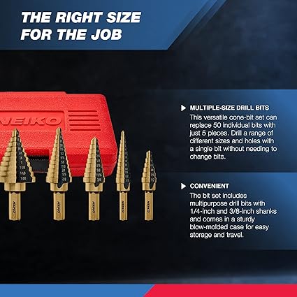 Kademeli matkap seti şunları içerir: 1/4 inç şaftta dört çok amaçlı metal matkap ucu ve 3/8 inç şaft ve arabanızda, garajınızda veya mağazanızda kolay rahatlık ve saklama için kırmızı üfleme şeklinde taşıma çantası.