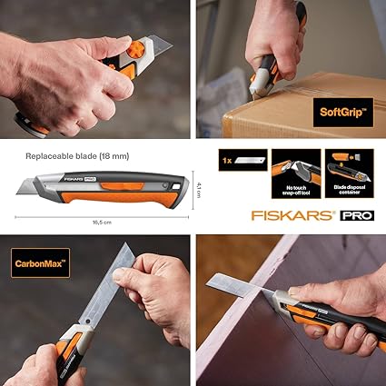 İçerik: 1 Fiskars CarbonMax Çok Amaçlı Bıçak, Yedek bıçak dahil, Uzunluk: 16,5 cm, Ağırlık: 154 gr, Malzeme: Paslanmaz çelik/Plastik, Renk: Siyah/Turuncu, 1027227