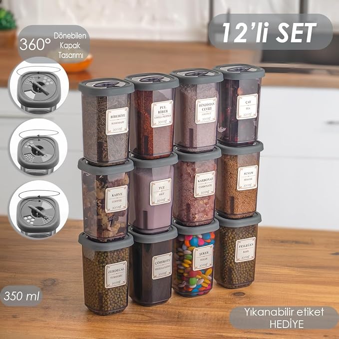 1059 12’li Döner Kapaklı Etiketli Baharatlık Seti – Füme Kilitlenebilir Kapaklı 350 cc
