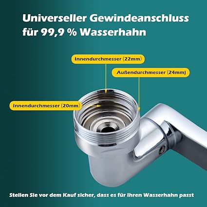 【Evrensel filtre musluk adaptörü hareketli】: Döner püskürtme regülatörümüz muslukların %99’u için uygundur. Su tasarrufu başlığı, 20 mm, 22 mm harici dişli ve 24 mm iç dişli bir musluk için uygundur.) Bu esnek musluk gömülü stil, iplik yok, su ağzı yuvarlak başlıklı musluk başlığı değildir, vs. satın almadan önce onay!