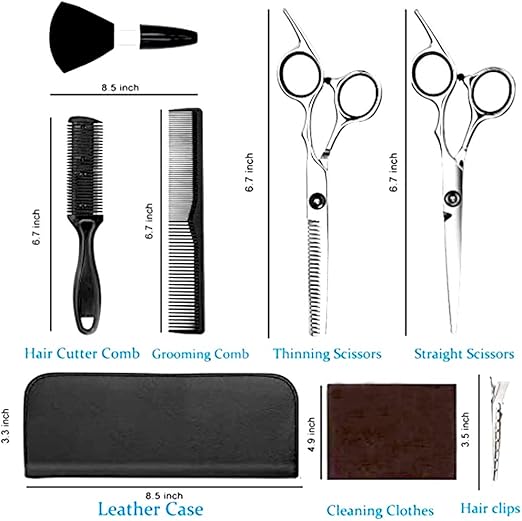 10’u 1 arada saç makası seti – 1 x düz makas, inceltme makası x 1, bakım tarağı x 1, saç tokası x 2, saç kesme tarağı x 1, deri çanta x 1, saç fırçası x 1, kuaför önlüğü x 1, temizleme bezi x 1. Saç kesme seti tüm saç kesme ve şekillendirme gereksinimlerinizi karşılar.