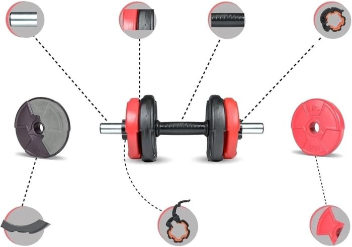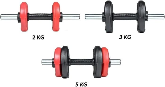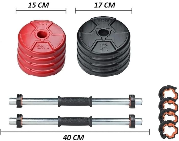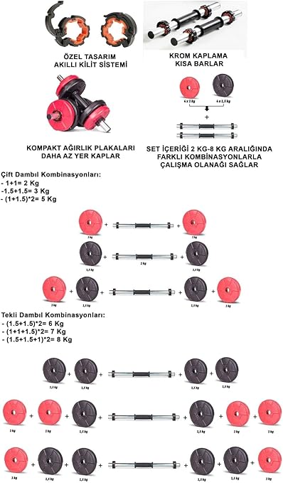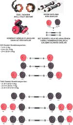 Çift bar için 2 Kg x2 , 3 kg x2 ve 5 kg x2 dambıl kombinasyonları mümkündür.