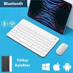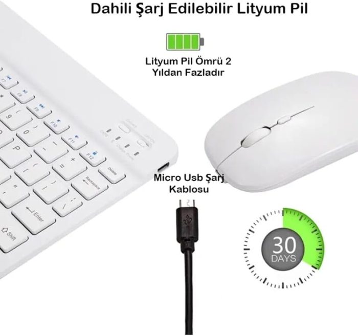 11. Nesil A16 11″ 2025 Tablet İçin Uyumlu Slim Şarjlı Türkçe Bluetooth Klavye ve Mouse Seti Beyaz