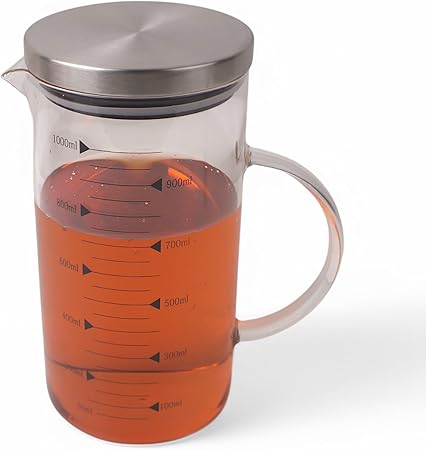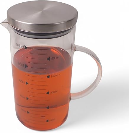 1100ml Metal Kapaklı Cam Yağlık ve Ölçü Kabı – Dayanıklı ve Şeffaf Sıvı & Kuru Malzeme Ölçme Kabı | Mutfak İçin Hassas Ölçüm ve Saklama Çözümü 1100ml – Cam Sürahi Ölçü Kabı