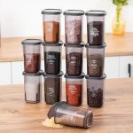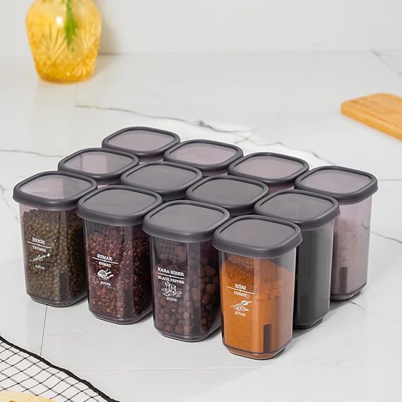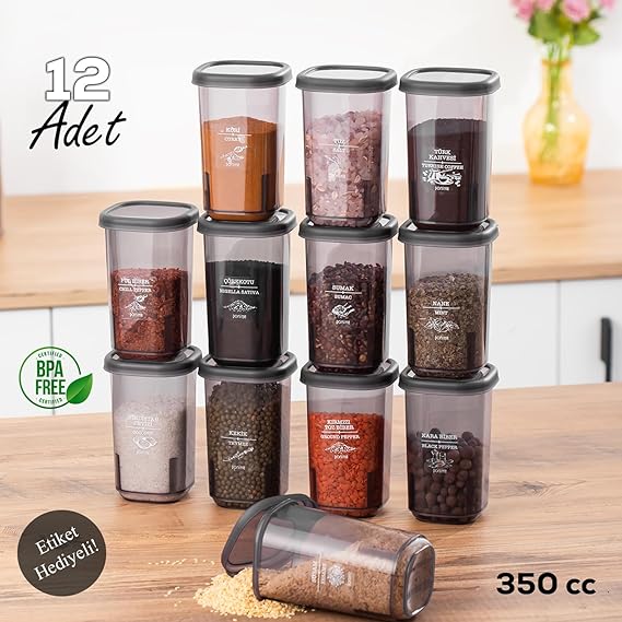 1107 12’li Sızdırmaz Düz Kapaklı Etiketli Baharatlık Seti – Yiyecek Erzak Saklama Kabı-Antrasit