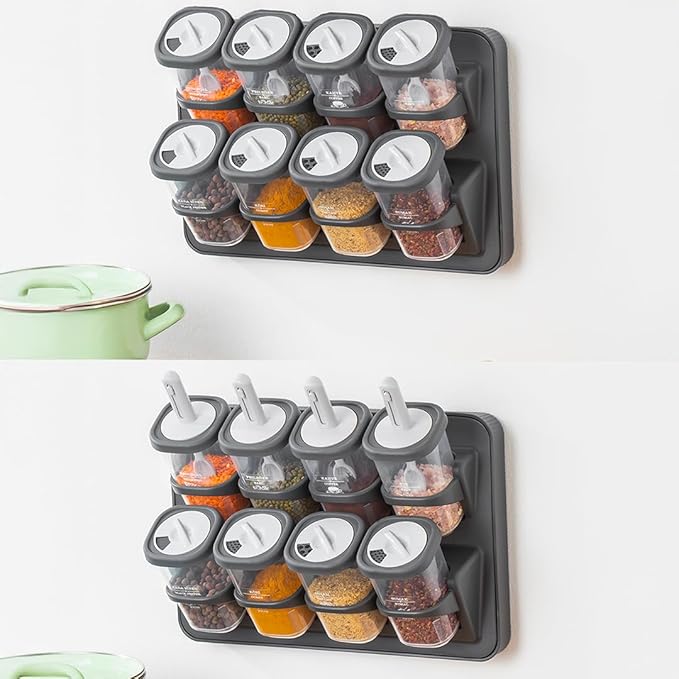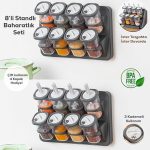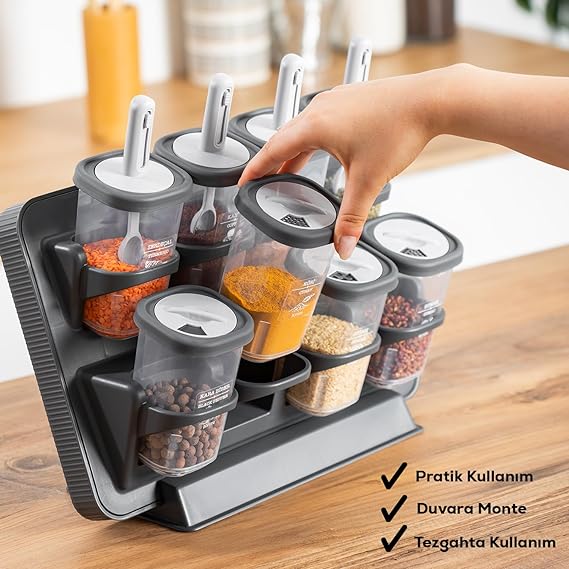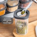 1117 Standlı Kaydırmalı Kaşıklı 360° Döner Kapaklı Etiketli Baharatlık Seti – Erzak Saklama Kabı Antrasit-Gri