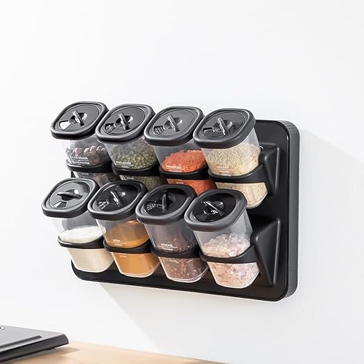 1121 Standlı 360° Döner Kapaklı Etiketli Baharatlık Seti – Erzak Saklama Kabı Siyah