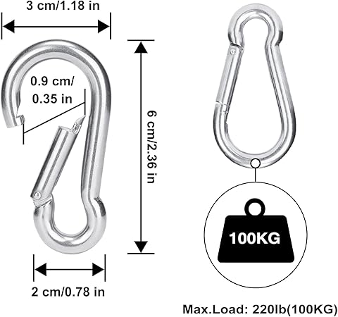 Uzunluk: 60mm, kayış kalınlığı: 6mm, bu karabina 100kg’a kadar yük tutabilir