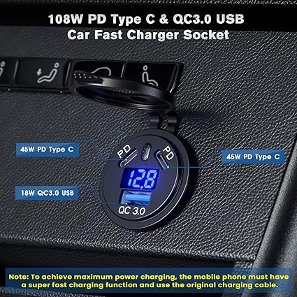 Üç USB Şarj Bağlantı Noktası: Çift 45W PD Tip C ve 18W QC3.0 USB Araç Bağlantı Noktası. Thlevel araç şarj soketi, toplam 108 W çıkış gücü ile üç uyumlu cihazı aynı anda şarj edebilir. Normal şarj cihazlarından dört kat daha hızlı. Not: Maksimum güç şarjı elde etmek için, telefonun süper hızlı şarj işlevine sahip olması ve orijinal şarj kablosunu kullanması gerekir.