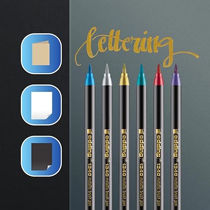 Set altın, gümüş, metalik kırmızı, metalik yeşil, metalik mavi ve metalik mor renklerinde 6 adet edding 1340 metalik fırça uçlu kalem içerir