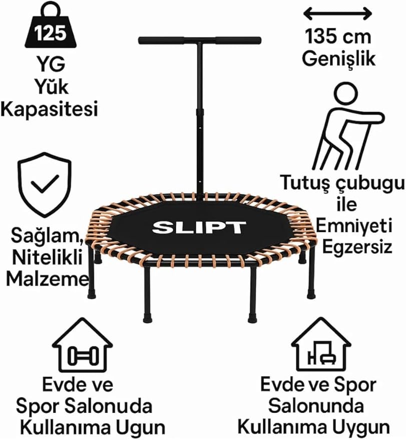 Tutunma barıyla destekli tasarım, kullanıcıların egzersiz sırasında denge sağlamalarına ve güvenle zıplamalarına yardımcı olur.