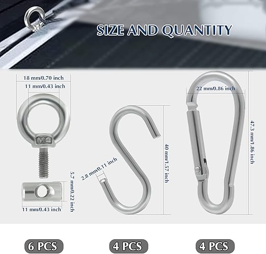 【Yüksek kaliteli malzeme】Bu tente rayı durdurucuları yüksek kaliteli 304 paslanmaz çelikten üretilmiştir, uzun ömürlü, güçlü ve paslanmaz. 4 karabina kanca ve 4 S kanca ile seyahat sırasında çok destek sağlar.