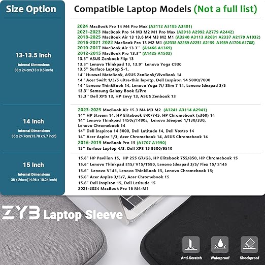 [Ürün Özellikleri]: 1 x ZYB 14 inç dizüstü bilgisayar kılıfı, 14-14,1 inç ve 2023-2025 MacBook Air 15 M4 M3 M2 ekran koruması sağlar. (İç boyut: 35 x 24,7 x 2,3 cm / 13,78 x 9,7 x 0,9 inç), 14 inç dizüstü bilgisayar kılıfı sipariş etmeden önce dizüstü bilgisayarınızın boyutunu kontrol edin.