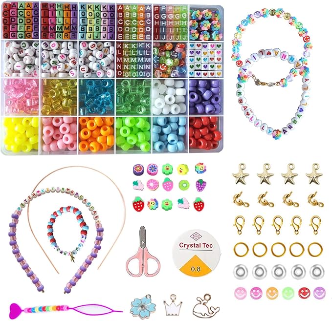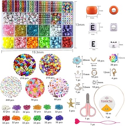 1600 adet Boncuk şunları içerir: 450 adet midilli boncuk, 360 adet kare harf boncuk, 210 adet oblate harf boncuk, 70 adet oblate gülümseme boncuk, 30 adet gülen yüz boncuk ve 60 adet kare kalp boncuk, 10 m kristal elastik iplerden oluşan bir rulo.